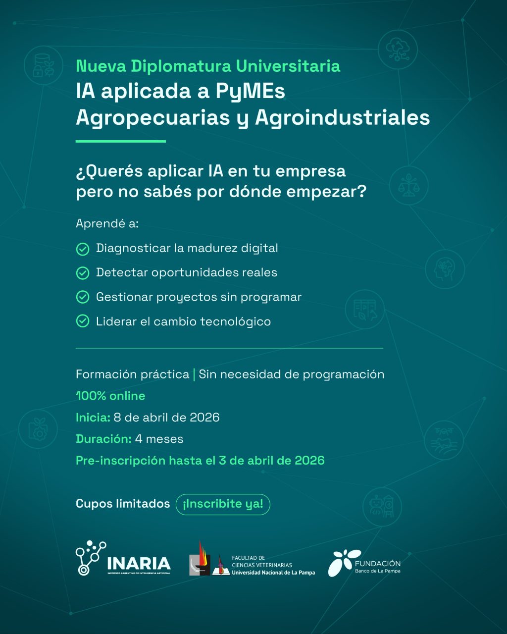 Se encuentra abierta la preinscripción para la segunda cohorte de la Diplomatura Universitaria en Inteligencia Artificial aplicada a PyMEs Agropecuarias y Agroindustriales, una iniciativa conjunta de la Facultad de Ciencias Veterinarias de la Universidad Nacional de La Pampa (UNLPam) y la Fundación Banco de La Pampa. La propuesta formativa, que cuenta con el respaldo del Centro de Desarrollo y Asistencia Tecnológica (CEDyAT) y el Instituto Argentino de Inteligencia Artificial (INARIA), tiene como fecha límite para la preinscripción el 03 de abril de 2026.
