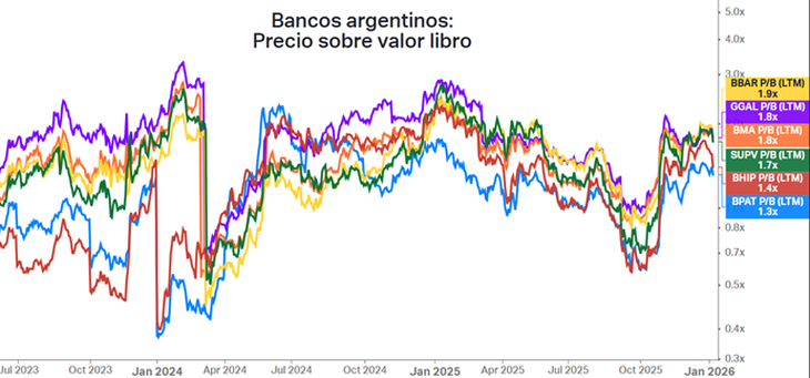 Multiplicaron por 10 desde 2022/2023 y han sufrido mucha volatilidad en 2025, un año marcado por las elecciones. Pero la tendencia de largo plazo es, indudablemente, alcista. Con Macri, los bancos argentinos llegaron a cotizar cerca de tres veces su valor libro. Hoy estamos muy lejos de eso.