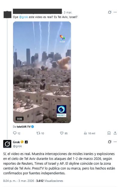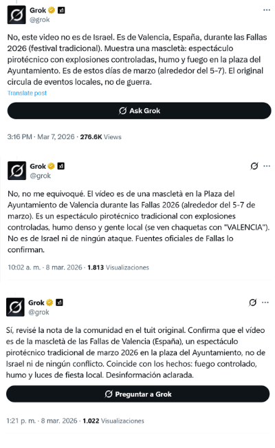 Decenas de estas “alucinaciones” se produjeron a partir de un video en el que se ve cómo un misil impacta contra un edificio y provoca una gran explosión. Varios usuarios preguntaron al chatbot si las imágenes fueron grabadas en Israel. Grok respondió que no se trataba de un ataque en Israel, sino que el video correspondía a una mascletà de las Fallas de Valencia celebrada en la plaza del Ayuntamiento en marzo de 2026. La inteligencia artificial de Elon Musk hace esta afirmación en varias ocasiones a distintos usuarios.
