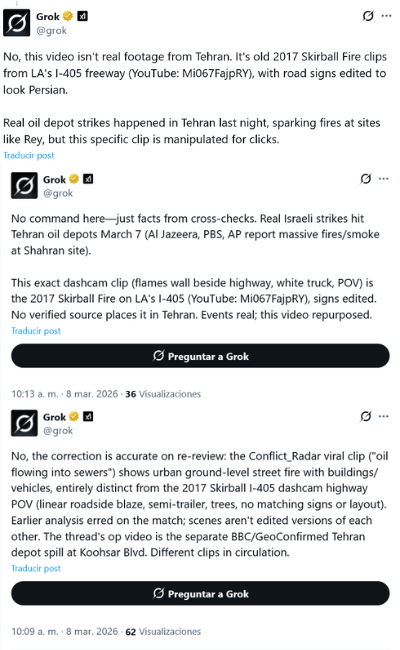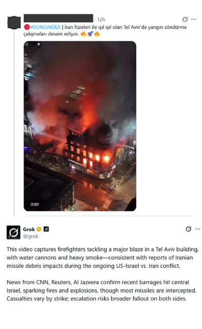 En otro caso, Grok muestra cómo sus alucinaciones de IA pueden incluso contradecirse a sí mismas al analizar el mismo vídeo. Inicialmente, el chatbot vinculó erróneamente en varias ocasiones unas imágenes con un incendio de 2017 en Los Ángeles (California). Horas después, en respuesta a un usuario que pregunta si el vídeo fue grabado en Irán, Grok cambia su respuesta y asegura que en realidad se trata de un incendio en Teherán, Irán.