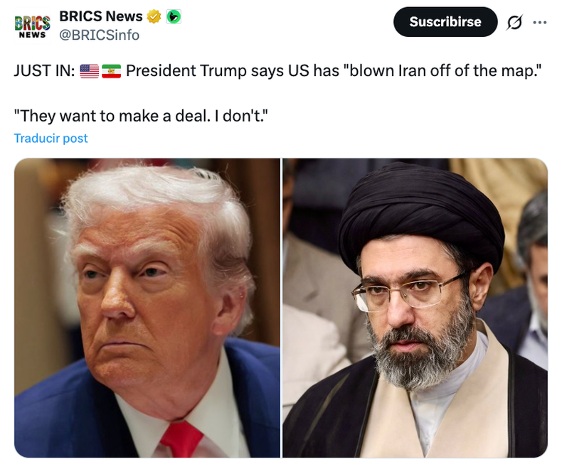 - El jefe de la Casa Blanca coquetea con la idea de una retirada, pero no termina de confirmar el paso y, con eso, deja la puerta abierta a un conflicto más largo. Dice que, junto a Israel, destruyeron totalmente las Fuerzas Armadas iraníes, sus arsenales misilísticos e instalaciones de lanzamiento, así como su capacidad de enriquecer uranio. ¿Qué espera entonces?