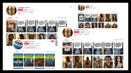 En Argentina, al menos 3 cuentas difundieron videos de manifestaciones ficticias hechos con inteligencia artificial. Tres de ellas tienen casi el mismo nombre de usuario: @torreeccsff, @torrecch5tg y @torreusecc5. Además de sus nombres, existe otra característica que indica una coordinación entre las cuentas: poseen una imagen de perfil similar: un Jesús con una Biblia en la mano.
