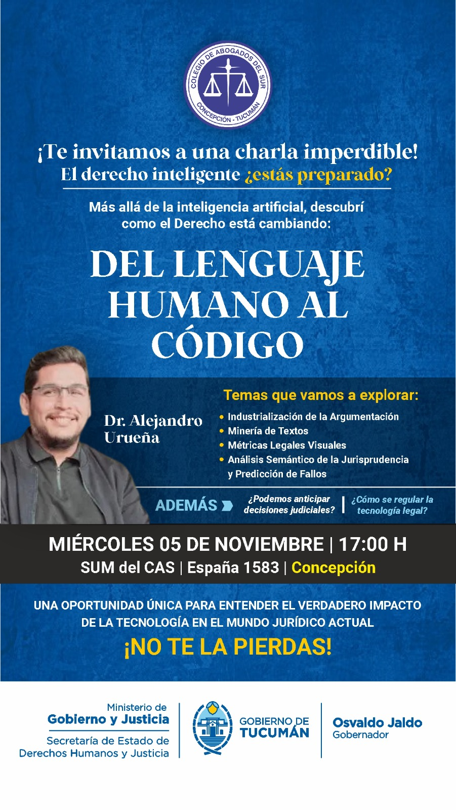 El Colegio de Abogados del Sur (Concepción, Tucumán) realizará la conferencia “Del lenguaje humano al código”, a cargo del Dr. Alejandro Urueña. La actividad se llevará a cabo el 5 de noviembre, a las 17:00, en el SUM del CAS (España 1583, Concepción).