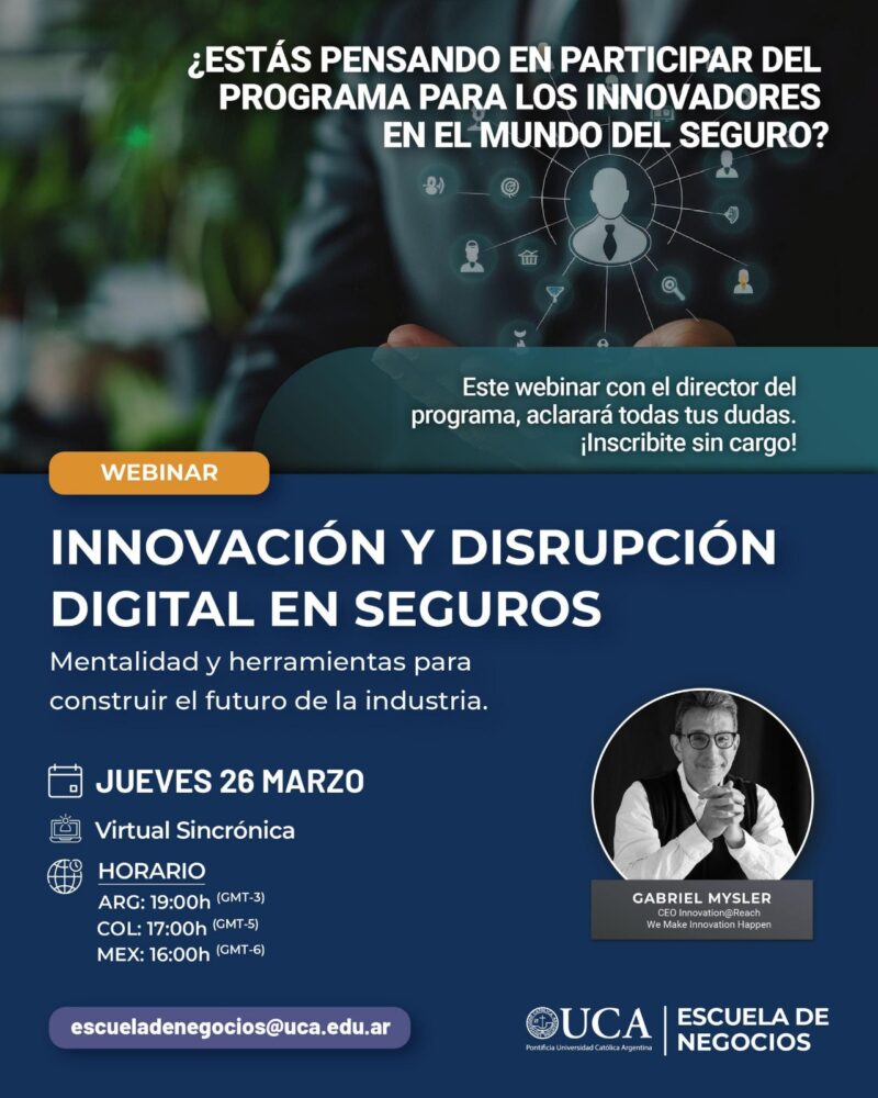 “Innovación y disrupción digital en seguros” es un programa ejecutivo que cumple ya 8 ediciones en la Escuela de Negocios de la Universidad Católica Argentina (UCA) y convoca a aseguradoras, brokers y asesores de seguros de Argentina y América Latina a cambiar la mirada sobre el seguro y sus desafíos. La base del programa es sumergirse en el pensamiento disruptivo antes de aprender de herramientas, metodologías o tecnologías y está pensado para entender que la innovación no es un destino, sino un camino.