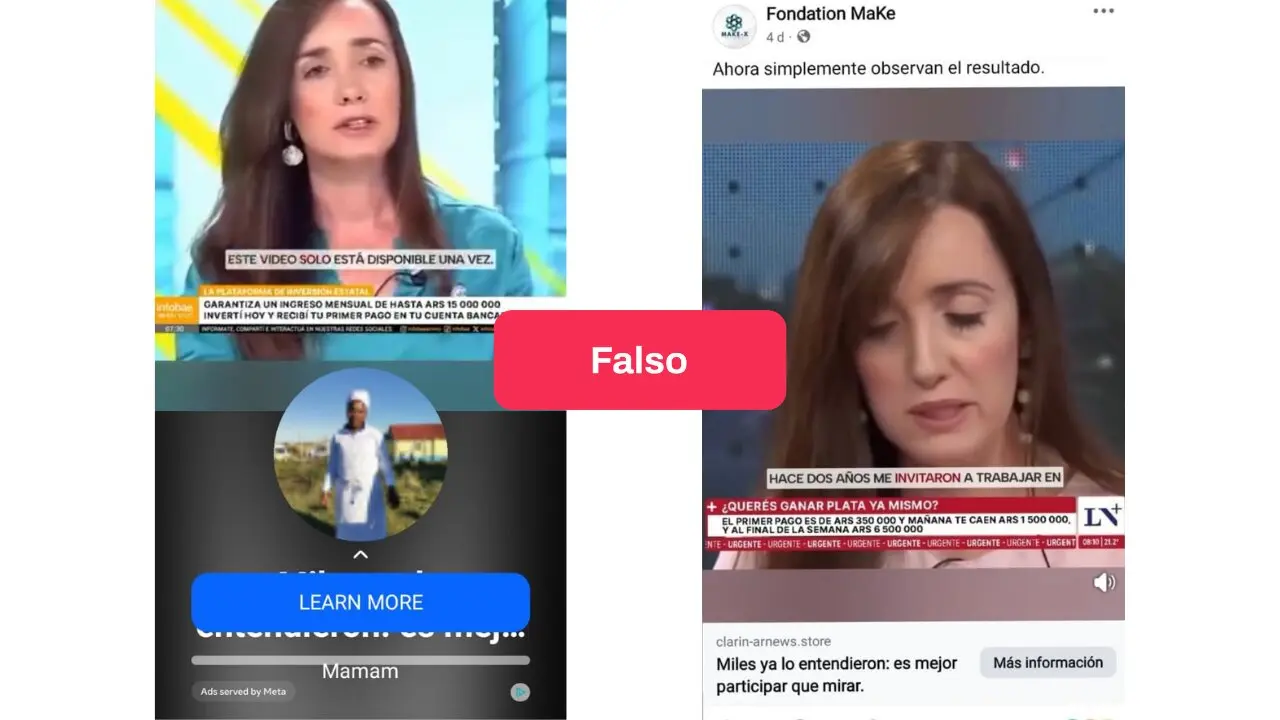 La estafa suele circular en posteos de redes sociales -que circulan como anuncios pagos de Meta- donde Villarruel supuestamente promociona “programas de inversión” que permitirían obtener ganancias rápidas y redirigen a páginas web fraudulentas que simulan pertenecer a medios de comunicación, como Clarín o Todo Noticias (TN).