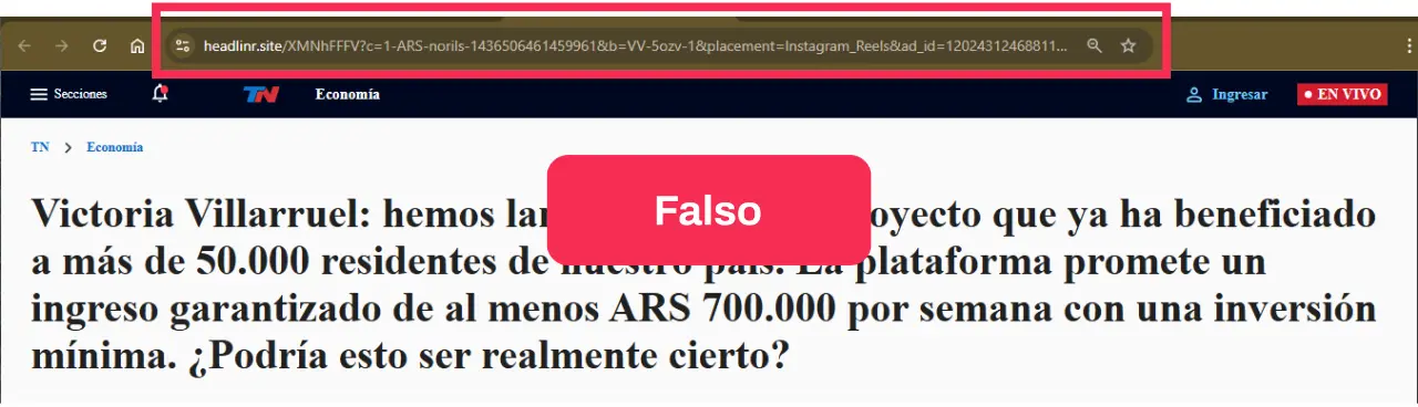 En la nota publicada en el presunto sitio de TN, se lee: “Victoria Villarruel: hemos lanzado un nuevo proyecto que ya ha beneficiado a más de 50.000 residentes de nuestro país. La plataforma promete un ingreso garantizado de al menos ARS 700.000 por semana con una inversión mínima. ¿Podría esto ser realmente cierto?”.