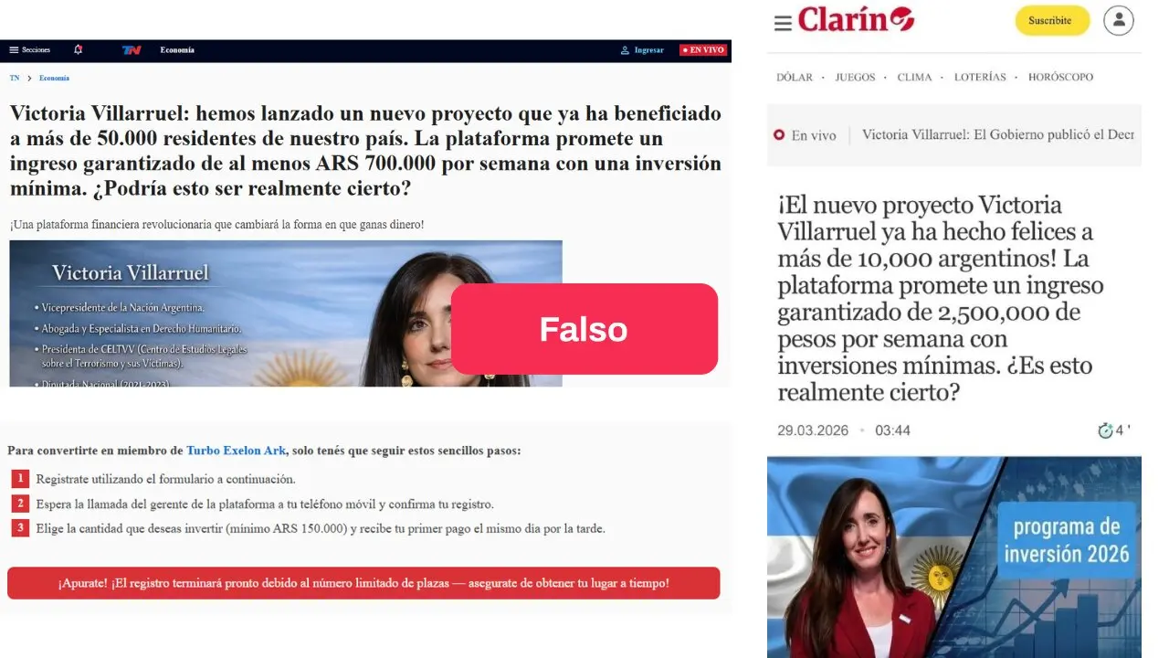 - Circulan posteos en redes sociales que muestran a la vicepresidente de la Nación, Victoria Villarruel, supuestamente promocionando una “plataforma de inversión” que ofrece ganancias mensuales de hasta $ 15 millones a cambio de un pago inicial. Las publicaciones redirigen a sitios web de presuntos medios con un formulario para inscribirse al proyecto.