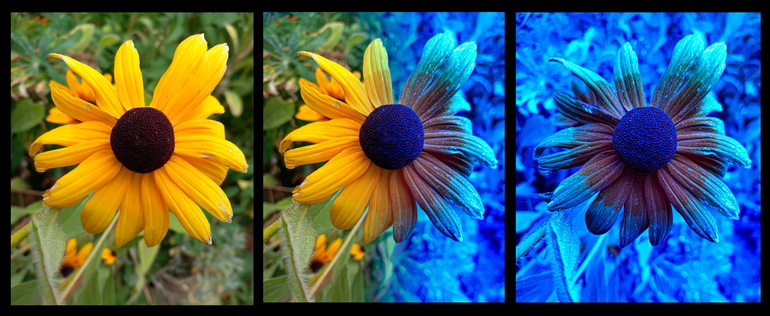 Flor Rudbeckia vista con el filtro “Paso de banda UV” para ver patrones UV escondidos a simple vista, patrones que los insectos pueden ver.